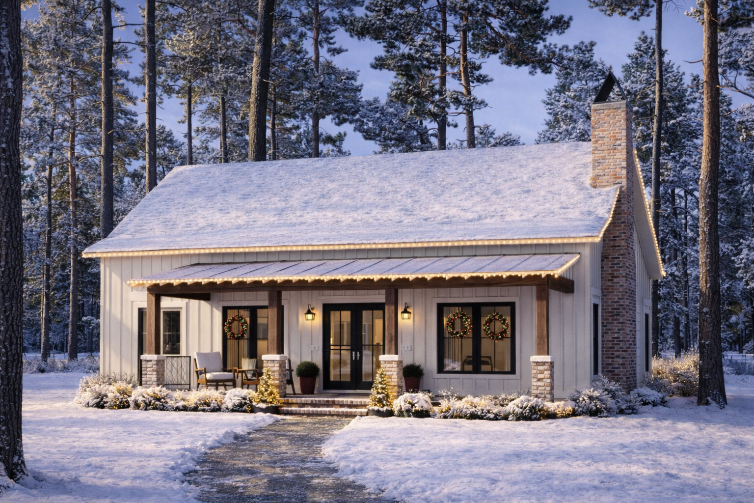 In addition to the front porch, a smaller side porch expands the outdoor living area and offers a secondary access point to the home. These porch spaces help connect the interior living areas with the surrounding landscape while enhancing the overall charm of the design. 2