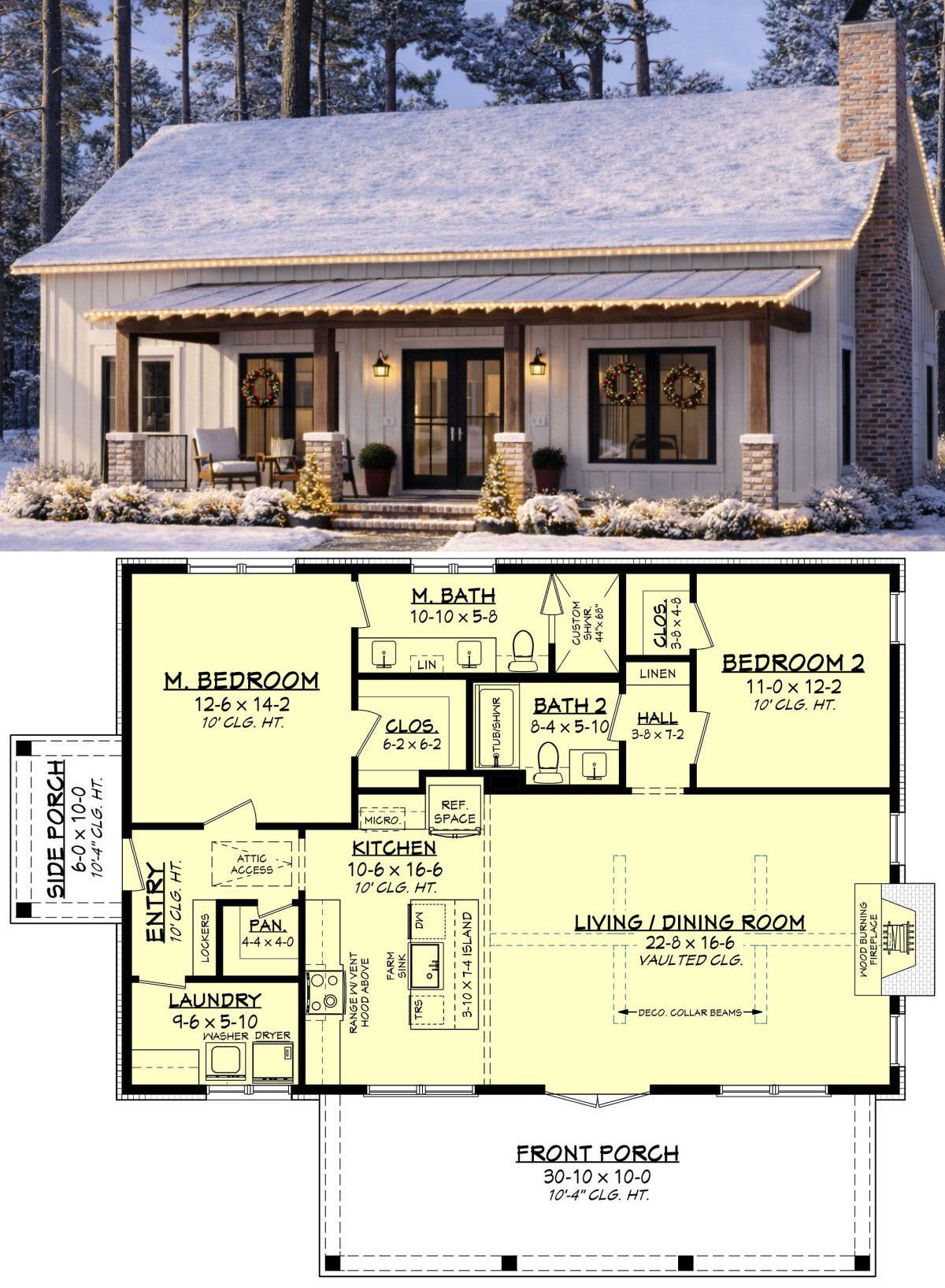 This attract ive modern farmhouse design offers approximately 1,320 square feet of heated living space with two bedrooms and two full bathrooms. Designed as a comfortable single-story residence, the plan blends rustic farmhouse character with contemporary interior efficiency. The layout emphasizes open living areas, functional circulation, and inviting outdoor spaces, making it ideal for couples, small families, or homeowners seeking a stylish yet manageable home. 0