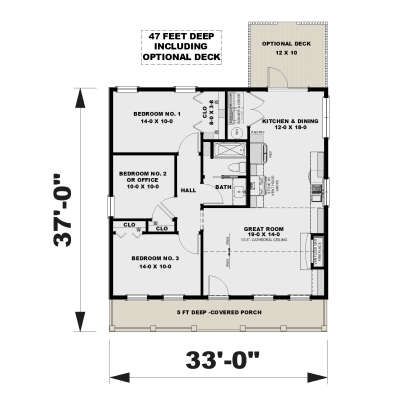 The overall width of the home is approximately 33 feet, with a depth of about 37 feet, yielding a compact yet functional footprint. The structure is a single-story layout, which simplifies construction and accessibility. Standard ceiling heights and typical framing methods support an affordable build without compromising comfort. 15