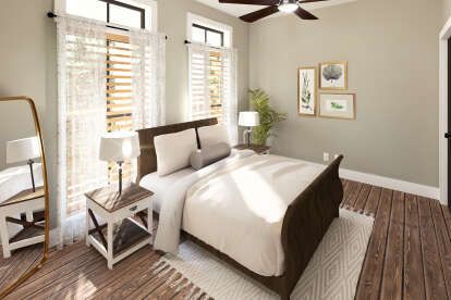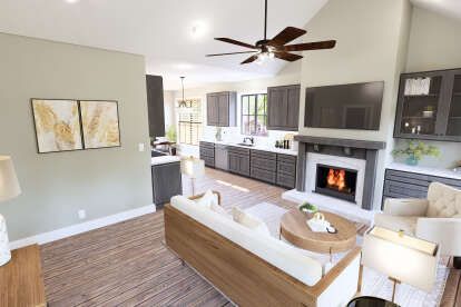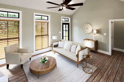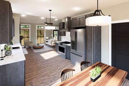 Stepping inside, the cottage plan offers a warm and intuitive layout. The heart of the home is an open living space that integrates the living room, dining area, and kitchen, fostering interaction and a sense of connectedness. At about 1,056 square feet, the design makes excellent use of every square foot to balance private and shared areas. 4
