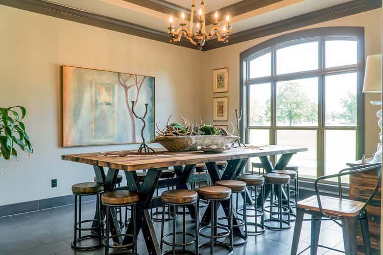 The exterior of the home speaks the language of modern Prairie design: a low-profile silhouette, broad eaves, strong horizontal lines and extensive glass. A U-shaped form creates a welcoming front elevation while wrapping around to embrace the courtyard. The 3-car garage sits naturally integrated into the design, keeping the façade clean and the priority on the home’s living spaces.