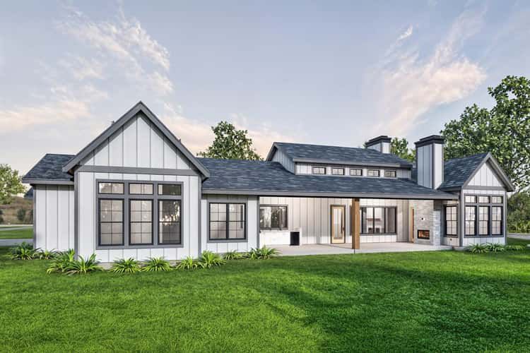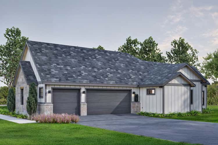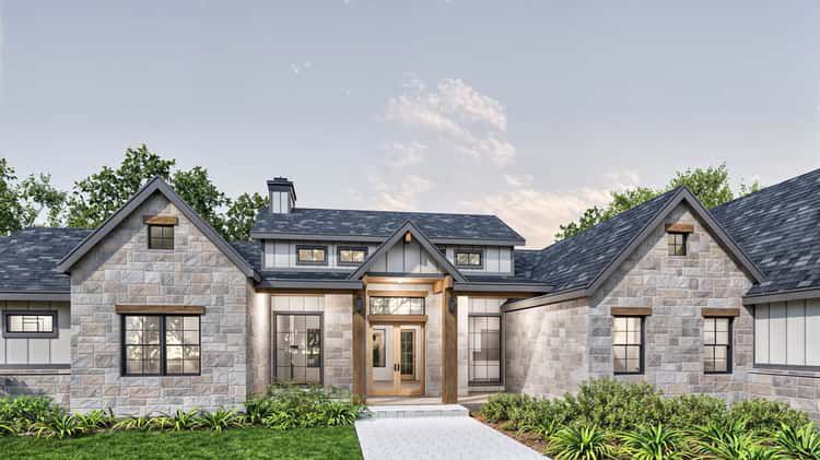 The home reveals a Hill Country aesthetic with its stone accents, broad roof overhangs and layered eaves. The façade invites you in through an arched entry framed by rustic yet refined materials. Approaching the home, the driveway curves gently and brings you to an attached garage that remains discreet, so the main living zone remains the visual focus. The width and depth support balanced proportions that feel settled and grounded.