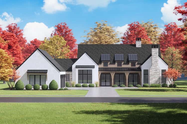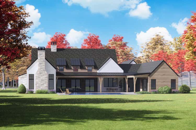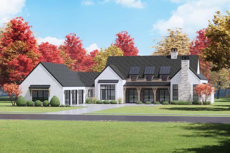 This modern farmhouse spreads across about 3,872 sq ft, offering 4 bedrooms, 4.5 baths and a 3-car garage in a layout that celebrates light, vaulted volume and abundant porch living. The plan’s three shed dormers—echoed front and back—bring daylight into a dramatic two-story great room while the generous front and rear porches frame the home’s curb appeal and outdoor life. 0