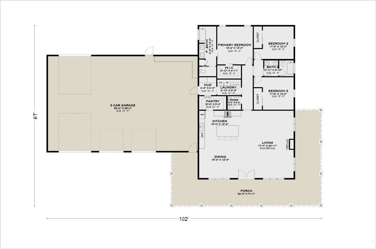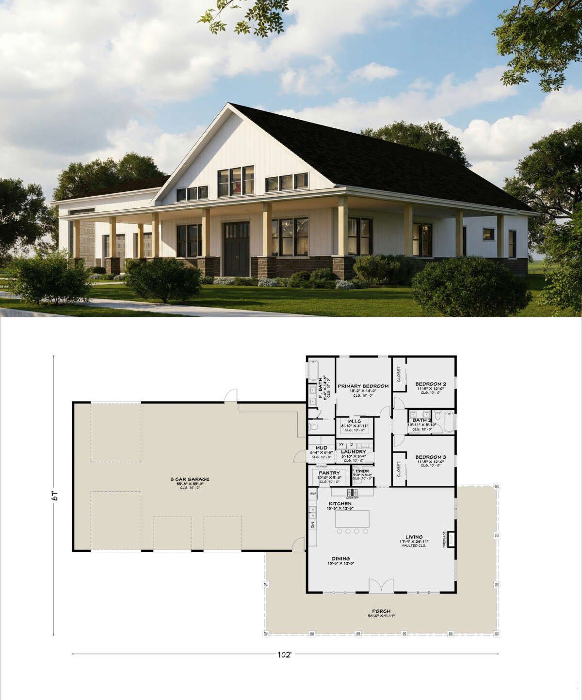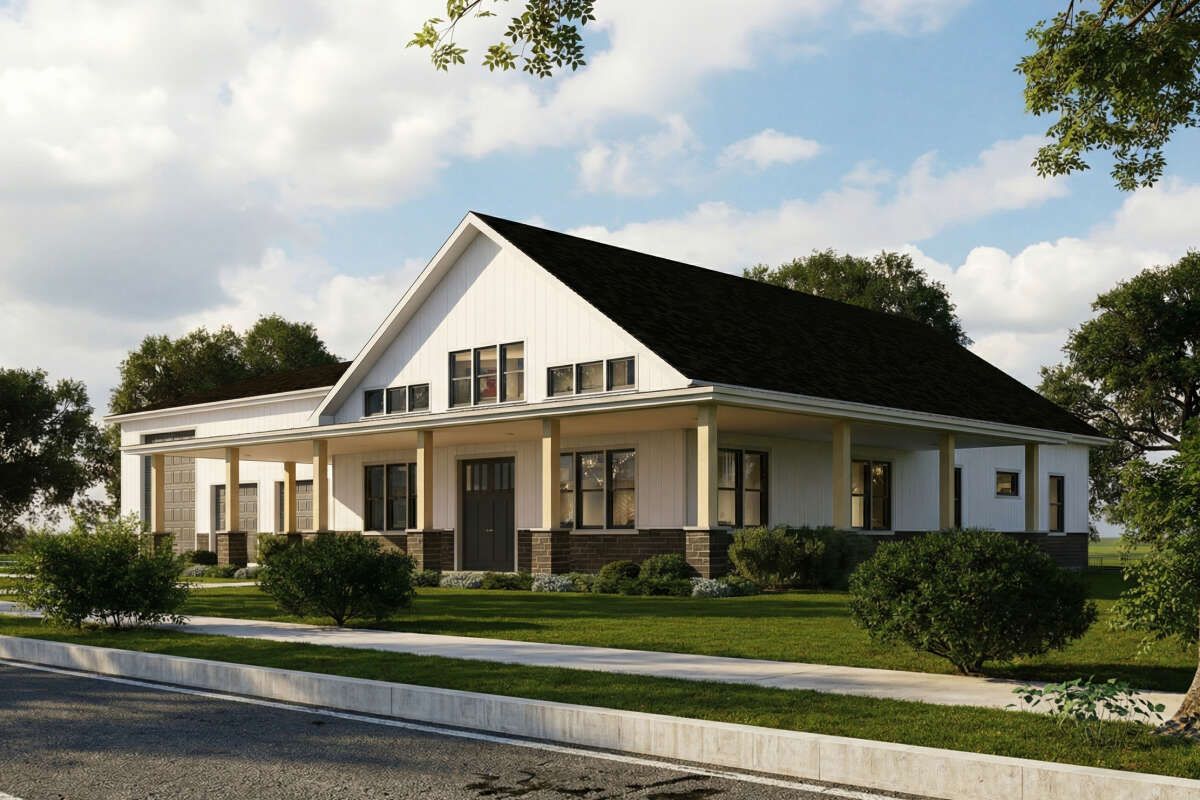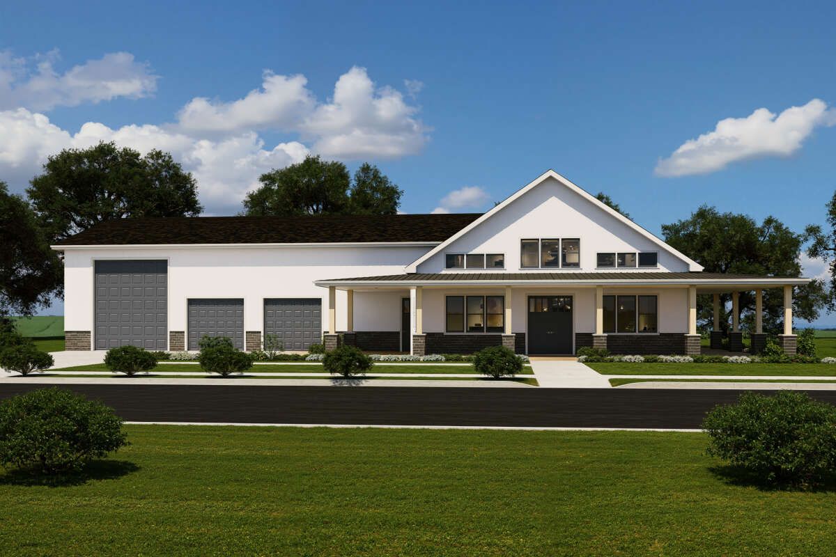 this barndominium house plan blends rustic barn-inspired architecture with modern living, creating a unique and practical home design.
