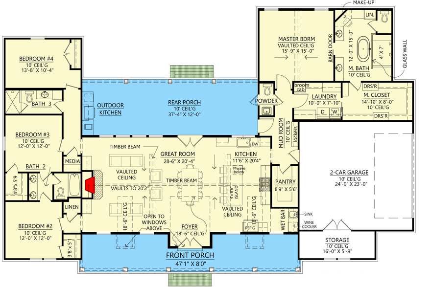 - Ceiling Heights: Main level 10′; great room vaulted up to ~18′6″ 12