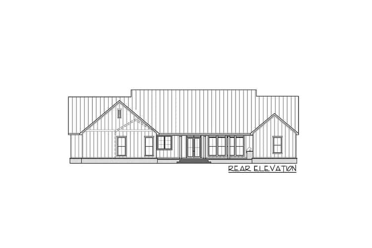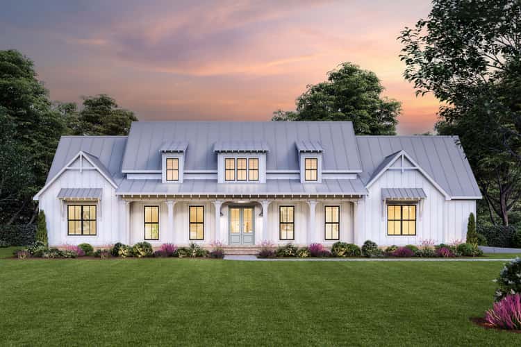 The home presents a refined modern farmhouse façade: board-and-batten siding, three shed dormers above an 8-foot-deep covered front porch, and exposed rafter tails that evoke craftsmanship. The width (~87′ 2″) and depth (~56′ 2″) give the home generous presence while maintaining accessible scale. 1