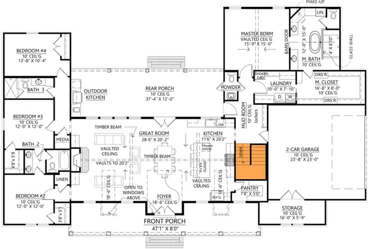 Outdoor living is built into the design. A deep front porch spans the width, offering a welcoming transition from yard to home. At the rear, French doors open from the great room to a 12-ft-deep back porch that includes an outdoor kitchen. This connection between interior and exterior creates an effortless entertaining zone and enhances everyday enjoyment. 2