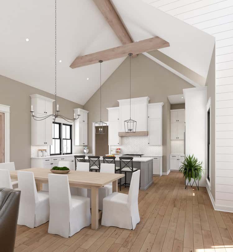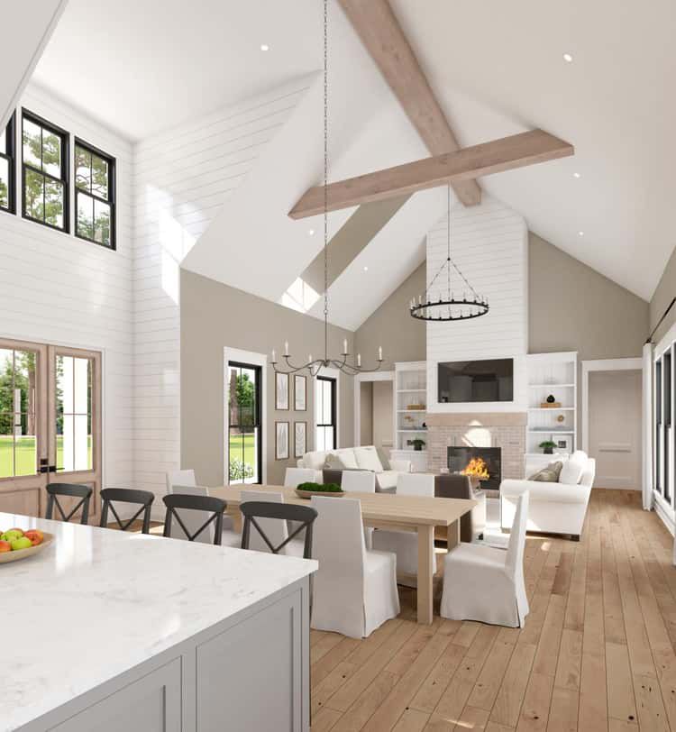 Stepping inside through French doors, you enter a foyer with a vaulted ceiling of up to 18′6″. The great room stretches ahead, framed by a timber ridge beam and floor-to-ceiling volume. A wall of French doors leads out to the back porch. The kitchen features a large 4′ × 8′6″ island with seating for four, a spacious walk-in pantry and a farmhouse sink that faces the outdoor activity—perfect for hosting and family life alike. 3