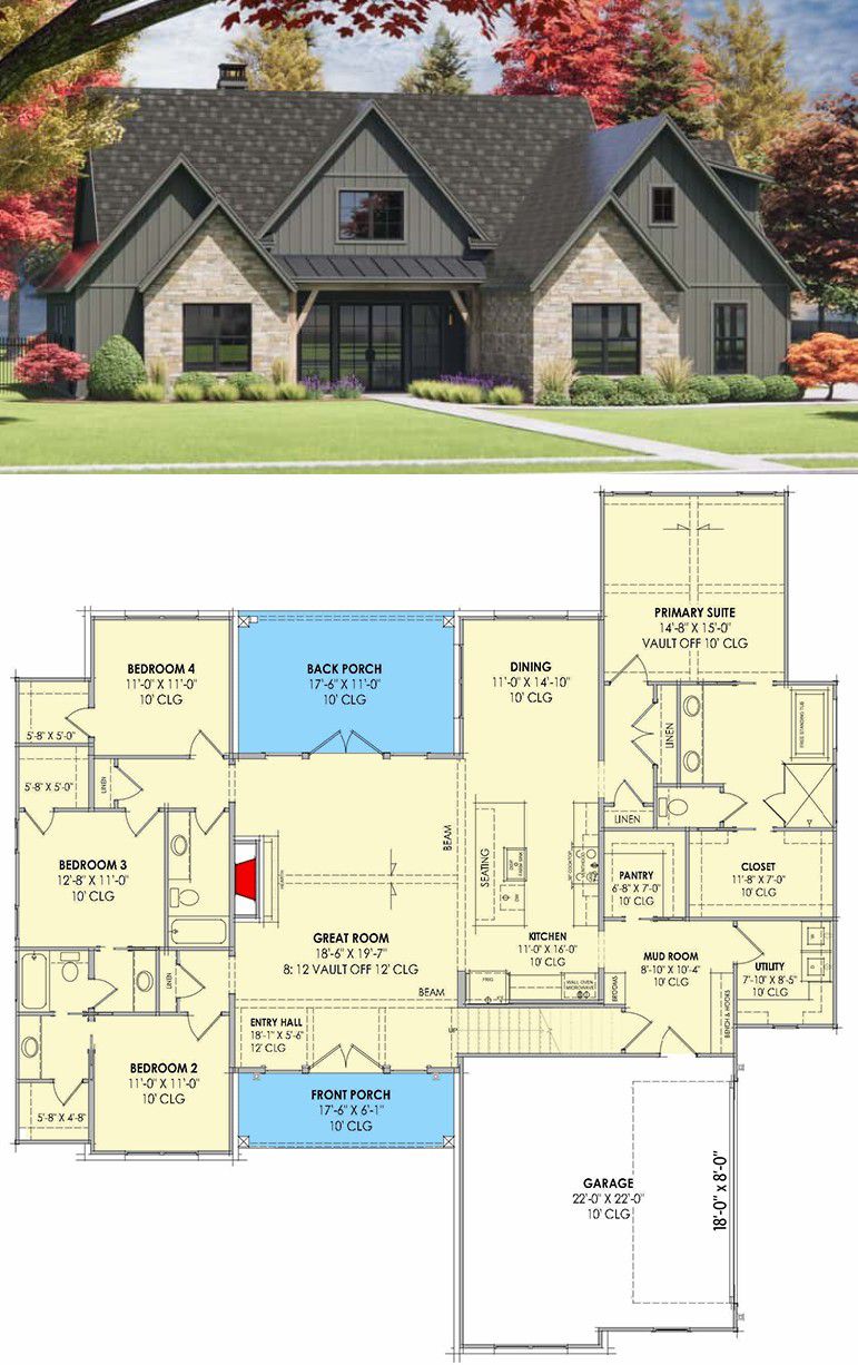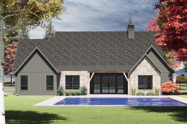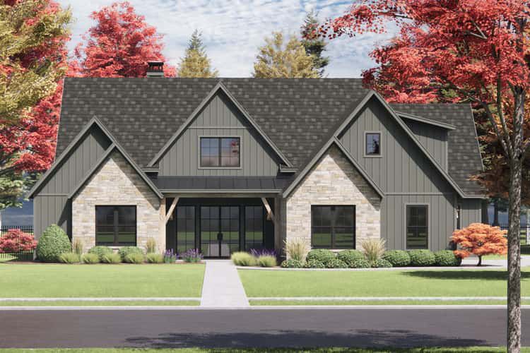 The exterior radiates a warm, rustic-inspired New American aesthetic: mixed siding textures, board-and-batten detailing, natural stone accents and a moderately pitched roof (primary pitch ~12:12 with secondary at 14:12). 1 The home’s footprint of about 66′ 10″ wide × 70′ 1″ deep offers a strong street presence without feeling massive. 2 The garage is thoughtfully tucked to the side—keeping the front façade welcoming and focused on the home’s character rather than vehicle bays.