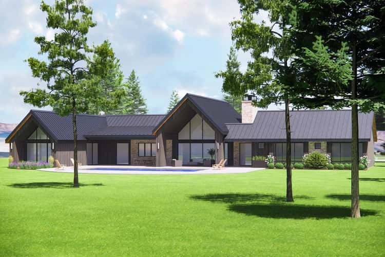 The façade blends mid-century modern lines with New Zealand-inspired clarity: large windows, strategic overhangs and clean geometric forms. The three-car garage features glass-panel doors which allow light and interest rather than dominating the front elevation. 1 The home’s layout and proportions make it ideal for a view-oriented lot or generous garden setting, while maintaining a one-level convenience footprint.