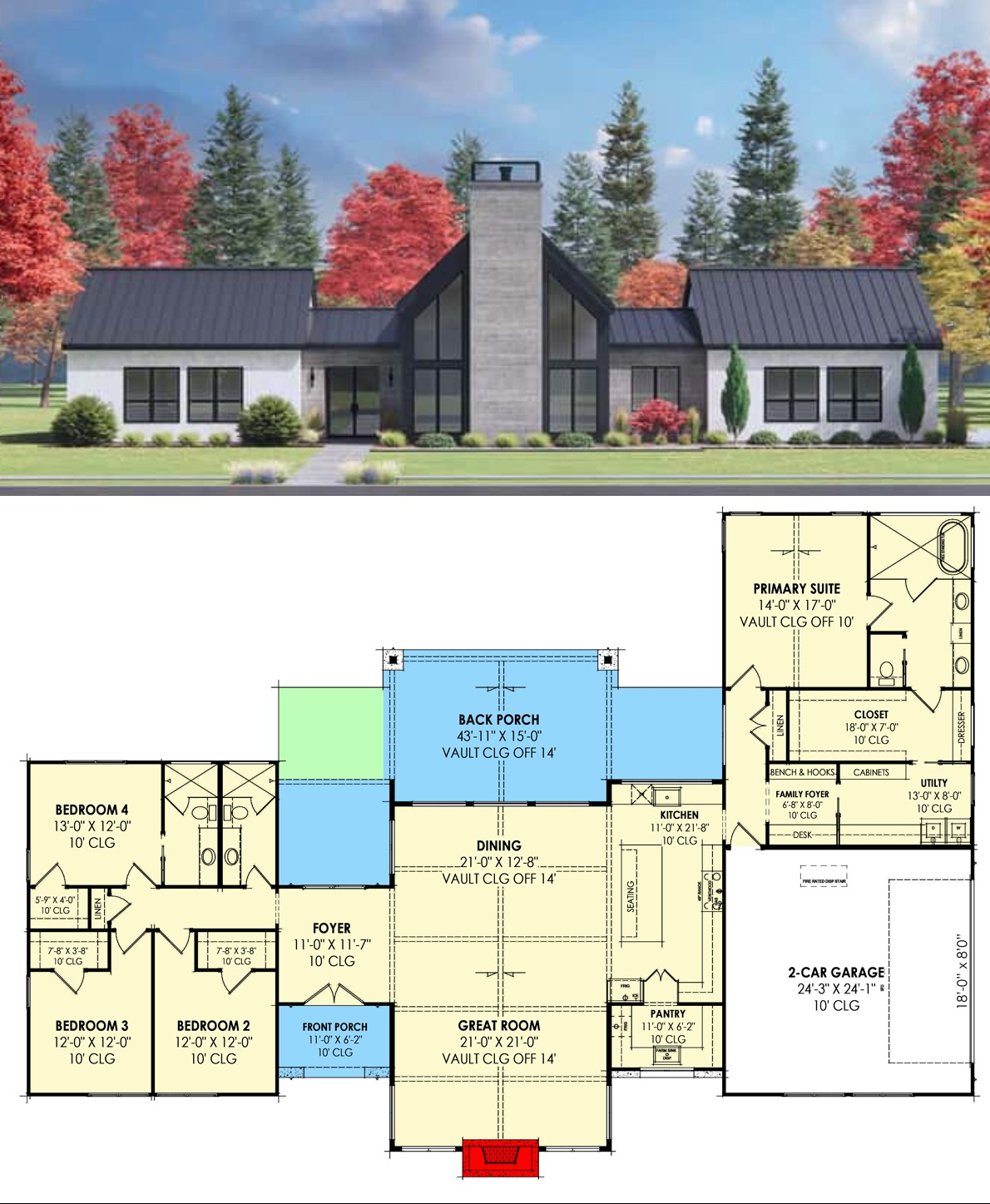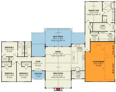 - Ceiling Heights: Main ceilings generous; great room and dining vaulted to ~14′