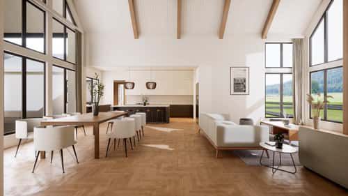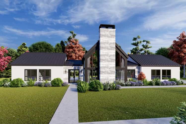 This Scandinavian-inspired modern ranch offers about 2,892 sq ft of one-level living, wrapped in clean lines and balanced symmetry. With 4 bedrooms, 3 full baths, a side-entry 2-car garage (~600 sq ft), and a vaulted great room that climbs to around 14 feet, it’s designed for people who love light, simplicity and calm, open interiors.