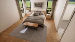 On the opposite side of the home, the master suite is tucked into its own wing. A vaulted ceiling echoes the main living volume but at a more intimate scale. The large walk-in closet connects directly to the laundry room, making everyday chores much easier—no long hauls with laundry baskets. The ensuite bath offers space for dual sinks and a generous shower, continuing the home’s calm, uncluttered feel.