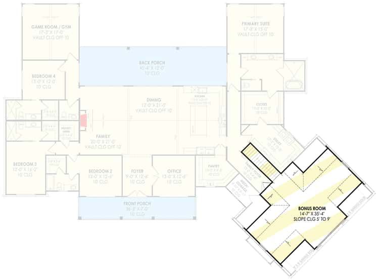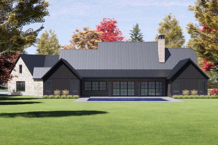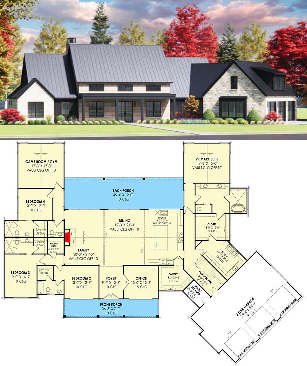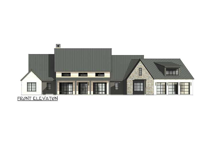 If your lot suits the width (114′ 7″) and depth (84′ 8″), and you want a home that is elegant yet comfortable, this modern farmhouse layout delivers big time.