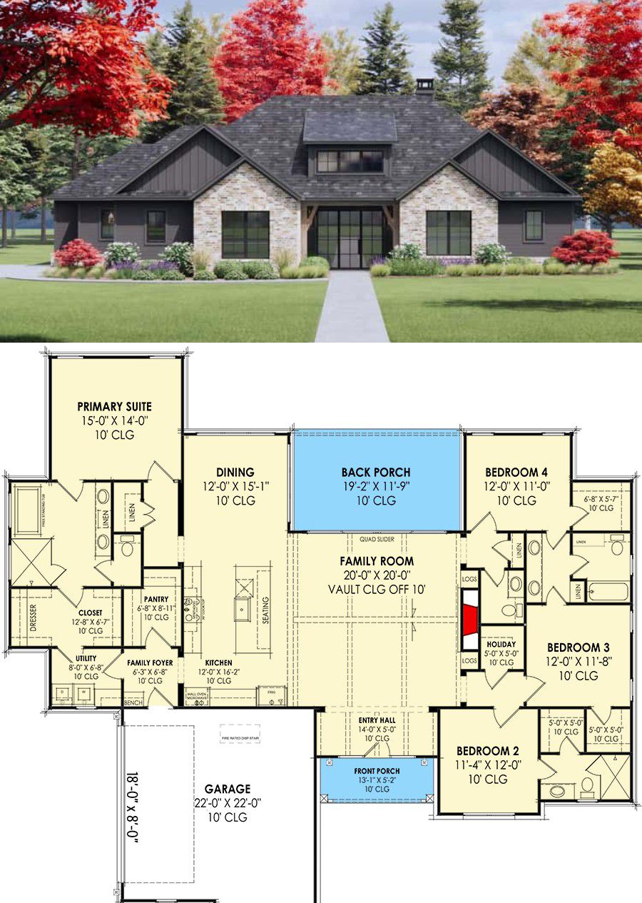 The façade features signature Craftsman elements: broad eaves, tapered columns, natural materials and a harmonious mix of textures. The side-entry garage keeps the front elevation neat and inviting. The covered back porch (about 19′2″ × 11′9″) anchors the rear with outdoor comfort and charm. 1