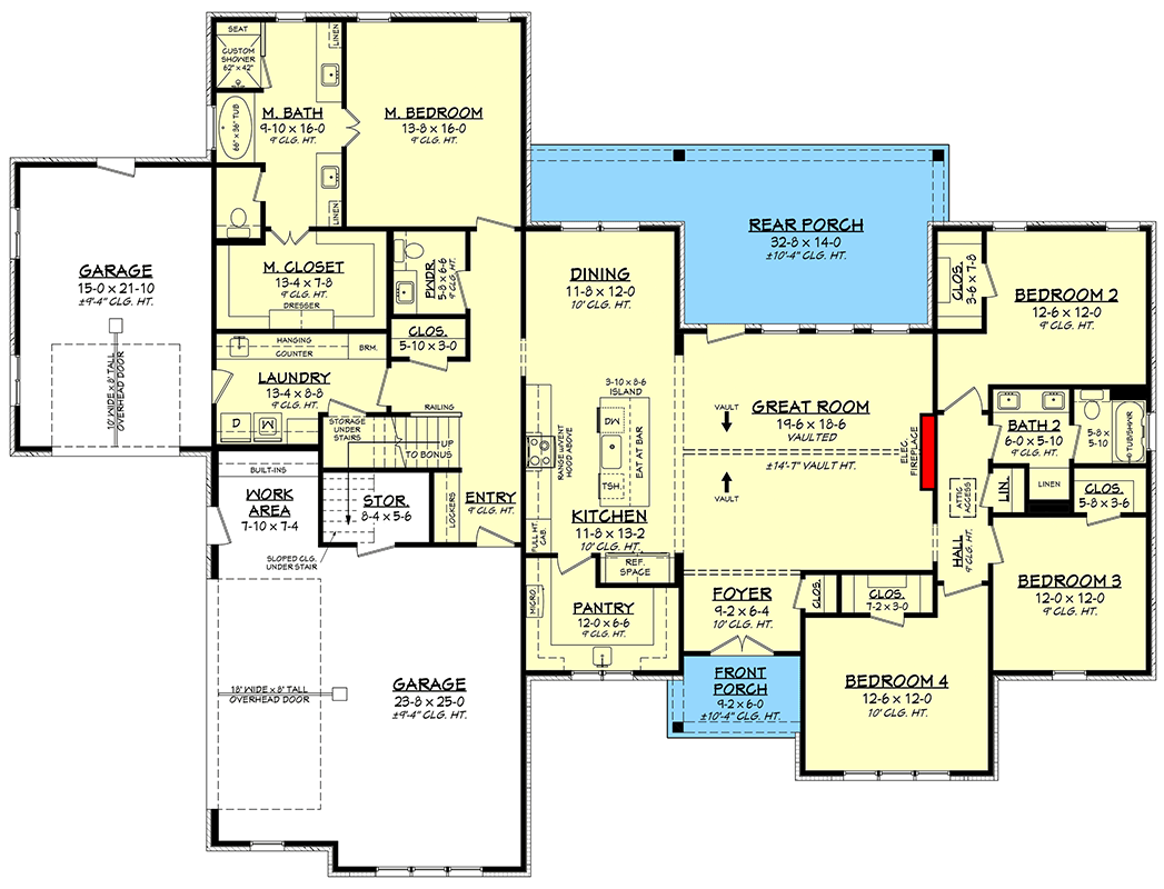 • Large rear porch expands living outdoors; the great room’s vaulted height brings volume and light.