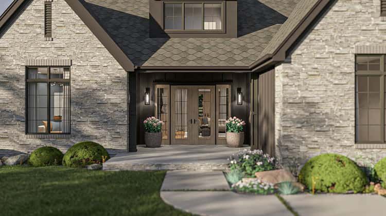The exterior combines modern cottage charm and upscale details: dark exterior tones, high roof pitches, and a mix of thinset stone and board-and-batten siding. 1 A welcoming covered front porch sets the tone for the home, with inviting architectural character from the moment you arrive.