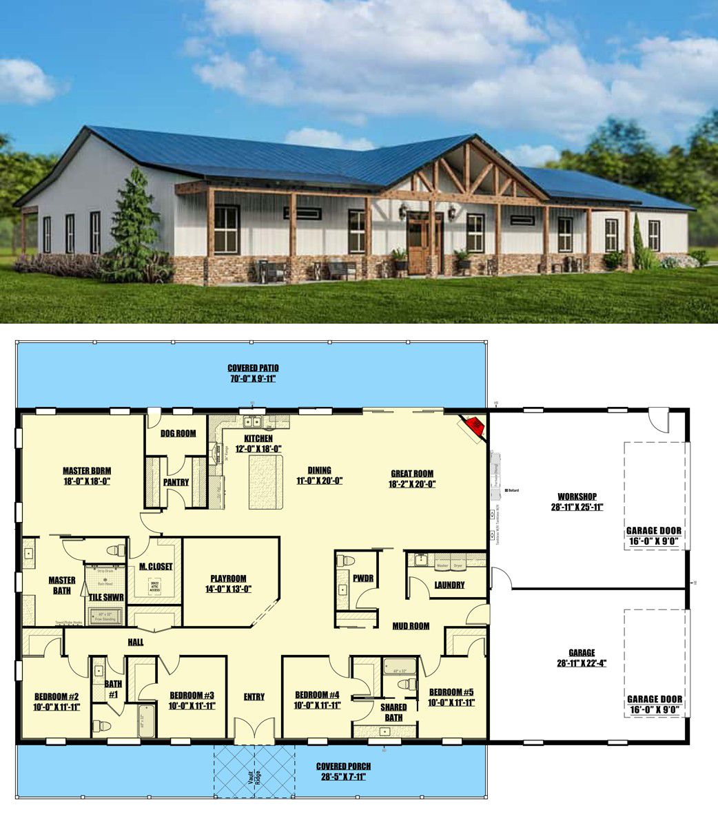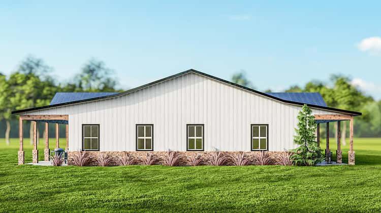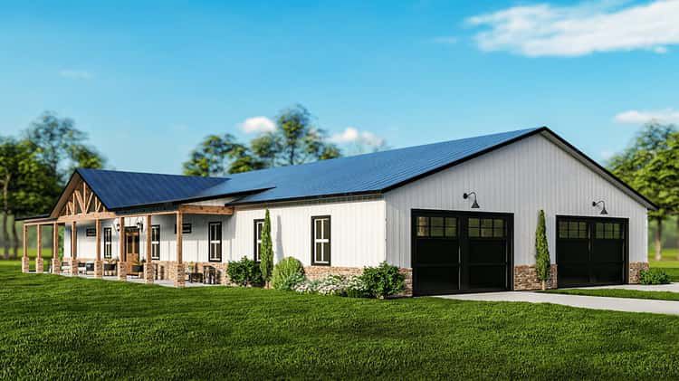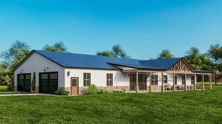 This impressive barndominium-style home plan delivers approximately 3,517 sq ft of heated living area on a single level, with a total of 5 bedrooms, 3 full baths + 1 half bath, and an attached 4-car garage (~1,483 sq ft). Its width of ~100′ and depth of ~76′ give it generous scale while staying on one floor. 0