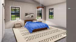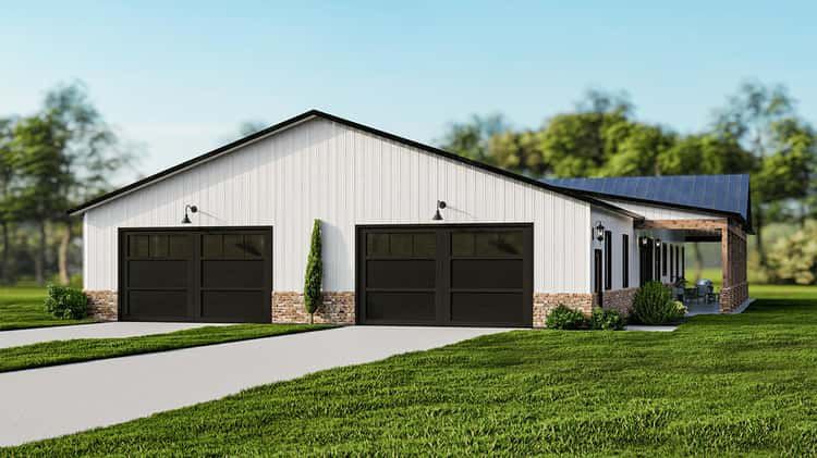 The exterior wraps the living zone between broad front and rear porches—about 7′11″ deep at the front and 9′11″ at the back—spanning the full width and anchoring the home in its landscape. 1 The garage-workshop occupies the right flank, with side-entry doors so the front maintains living and entry focus. The design blends rustic barn cues with refined detailing—deep overhangs, mixed materials, and large windows that hint at indoor-outdoor living.