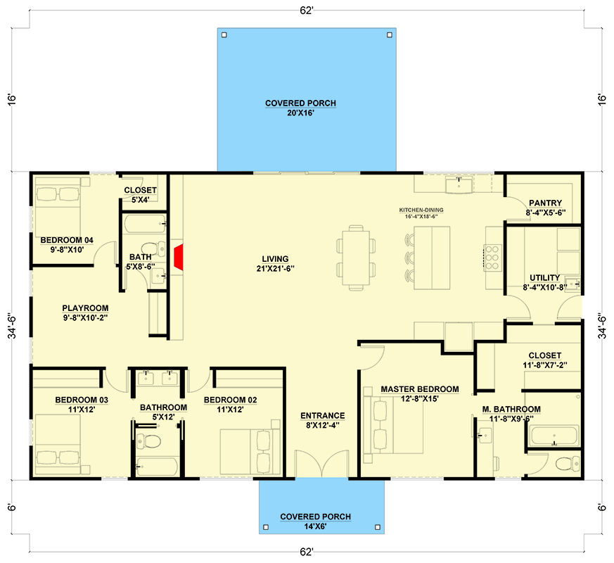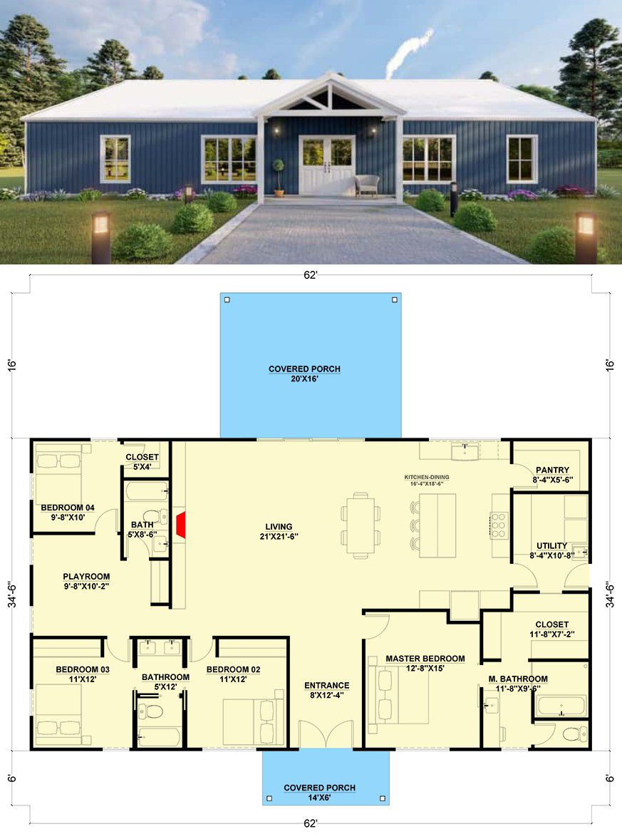 - Footprint / Dimensions: ~62′ 0″ wide × ~34′ 6″ deep 12