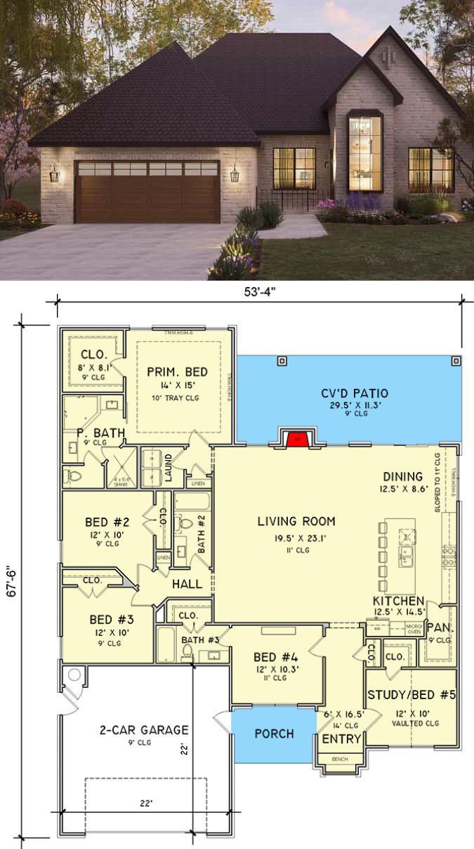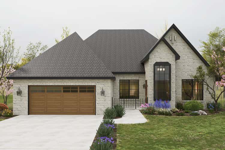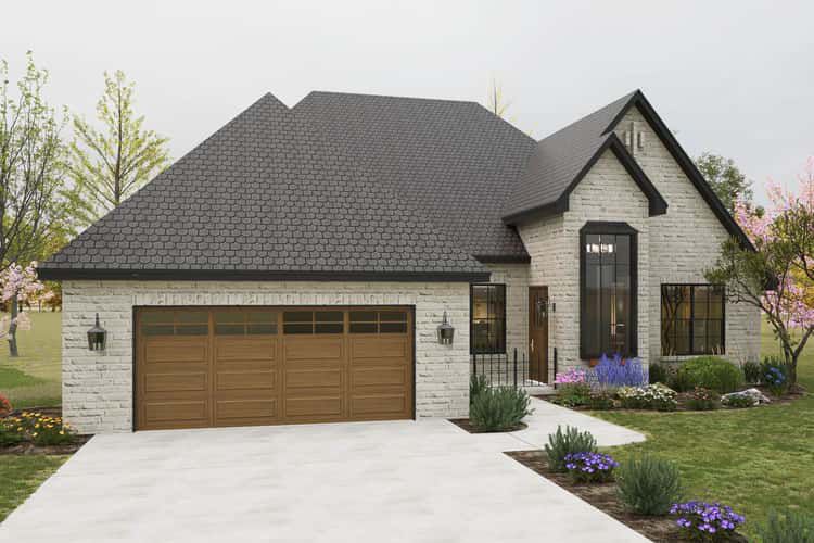Measuring roughly 53′ 4″ wide × 67′ 6″ deep, the home presents a compact yet upscale footprint that blends French country character with modern ease. 1 Natural-stone accents or stucco, a steep roof ridge (~29′ 6″ high), and traditional porch detailing evoke timeless style. The covered front porch (~74 sq ft) adds charm and shelter to the entry. 2
