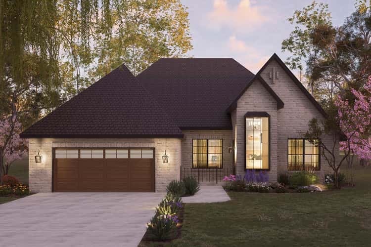 Measuring roughly 53′ 4″ wide × 67′ 6″ deep, the home presents a compact yet upscale footprint that blends French country character with modern ease. 1 Natural-stone accents or stucco, a steep roof ridge (~29′ 6″ high), and traditional porch detailing evoke timeless style. The covered front porch (~74 sq ft) adds charm and shelter to the entry. 2