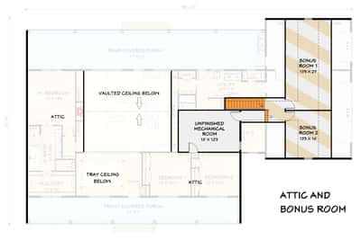 The attached 3-car garage offers ample space for vehicles, equipment, storage — a big bonus for many homeowners. On top of that, the plan includes a dedicated mechanical room (in the attic, over the bonus-room level) for HVAC, water heaters, or other systems. This helps keep utilities out of sight and preserves living and storage areas. 7