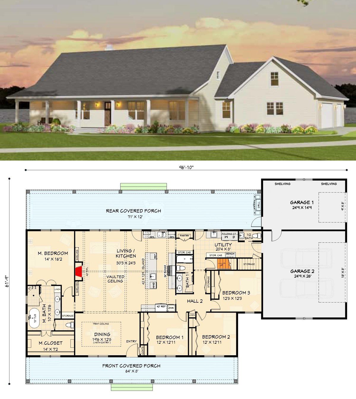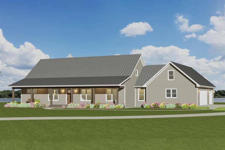 The exterior shows classic farmhouse-ranch charm — modest rooflines, straightforward proportions, and a layout that feels welcoming and down-to-earth. The attached 3-car garage gives plenty of space for vehicles or storage, while keeping the main house facade clean and domestic rather than garage-dominated. 1