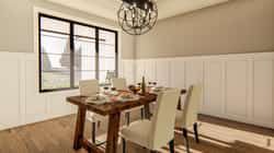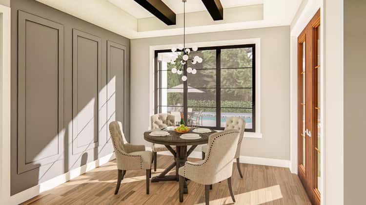 You step first into a formal dining area with exposed wood beams — rustic touches that lend character and warmth. 4 The dining room flows into a great room warmed by a fireplace and anchored by built-in shelves — ideal for cozy family time or entertaining. 5