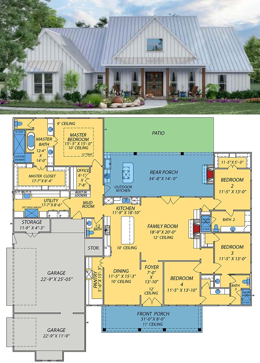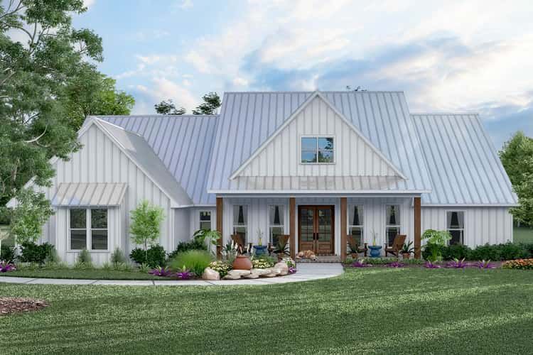 The home measures about 75′ 6″ wide × 77′ 2″ deep, with a max ridge height around 29′ 4″. 1 Its farmhouse-style architecture combines practicality with charm — making it suitable for a variety of lot sizes while delivering that welcoming, homey curb appeal. 2