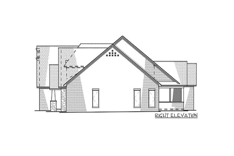 The front façade evokes European countryside charm: brick and stone exterior walls, substantial timbers, and a covered front entry welcoming you into the home. The house footprint is about 67′ 2″ wide by 65′ 8″ deep, with a max ridge height of around 31′. A two-car attached garage (≈ 591 ft²) sits at the front, with standard slab or crawl-type foundation. 2
