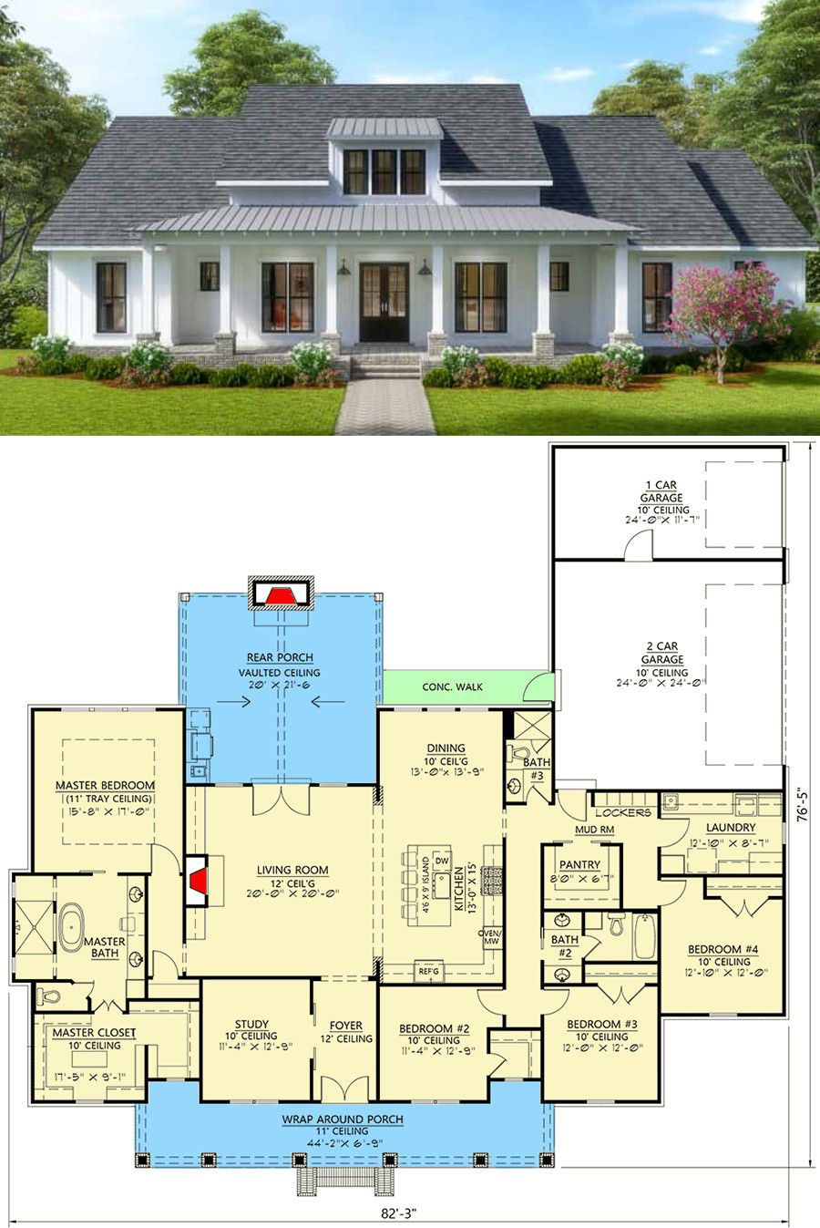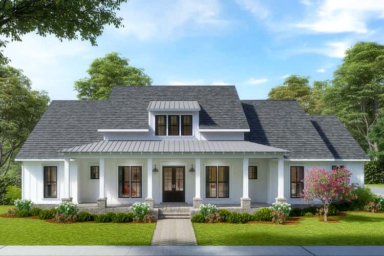 This modern-farmhouse plan delivers about 2,815 sq ft of living space on a single level, blending farmhouse charm with thoughtful modern design. The home includes 4 bedrooms, 3 full bathrooms, and an open layout centered on comfort and flow. What makes it special is its vaulted rear porch — a built-in invitation to outdoor living. 0