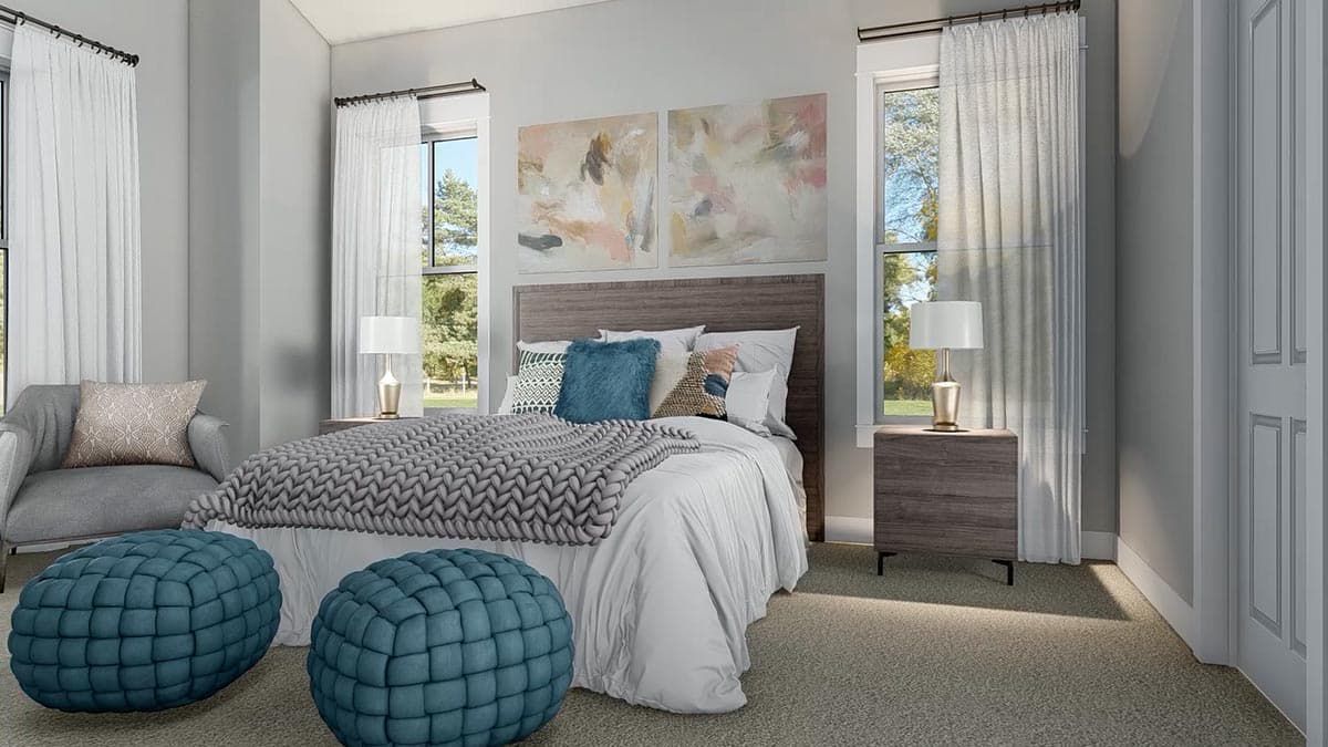 The **master bedroom** sits on one wing of the house, offering peace and privacy. It also features vaulted ceilings, which make the space feel open and restful. 12