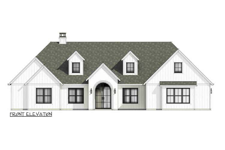 This plan delivers a comfortable, elegant single-story European-transitional style home, ideal for a family desiring functional living spaces, a home office, and traditional charm blended with modern layout conveniences.