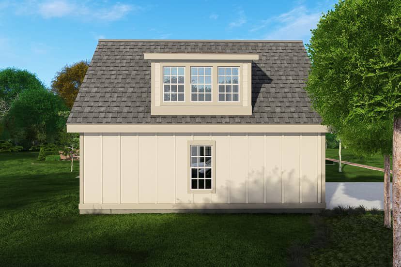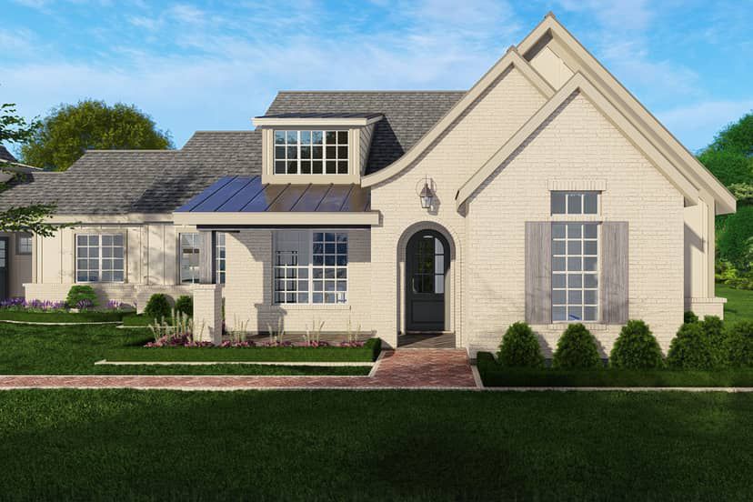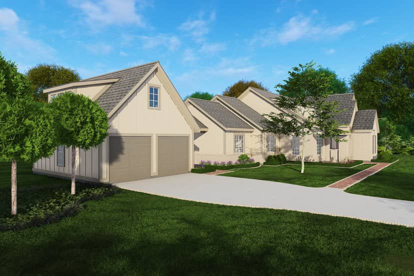A side-entry garage maintains the warm visual core of the front elevation, preserving symmetry while adding practical parking space out of direct street view.