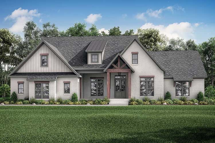 The exterior blends textured materials — brick, board-and-batten siding, and timber-accent details — giving the home appealing rustic-American charm without being overly ornate. 0 The home spans roughly 78′ 4″ wide × 67′ 4″ deep, giving it a substantial footprint that still feels grounded and homey. 1