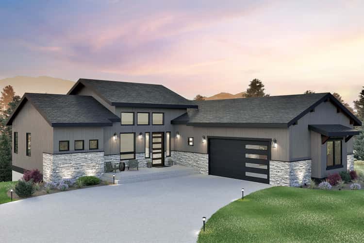 The exterior balances contemporary styling with mountain home character. Clean lines, generous windows, and a broad front façade create a sense of modern presence that still feels at home in rugged or scenic settings. Large decks and rear glazing support a strong indoor-outdoor connection — perfect for lots with views, wooded backdrops, or breezy hilltop sites. 0