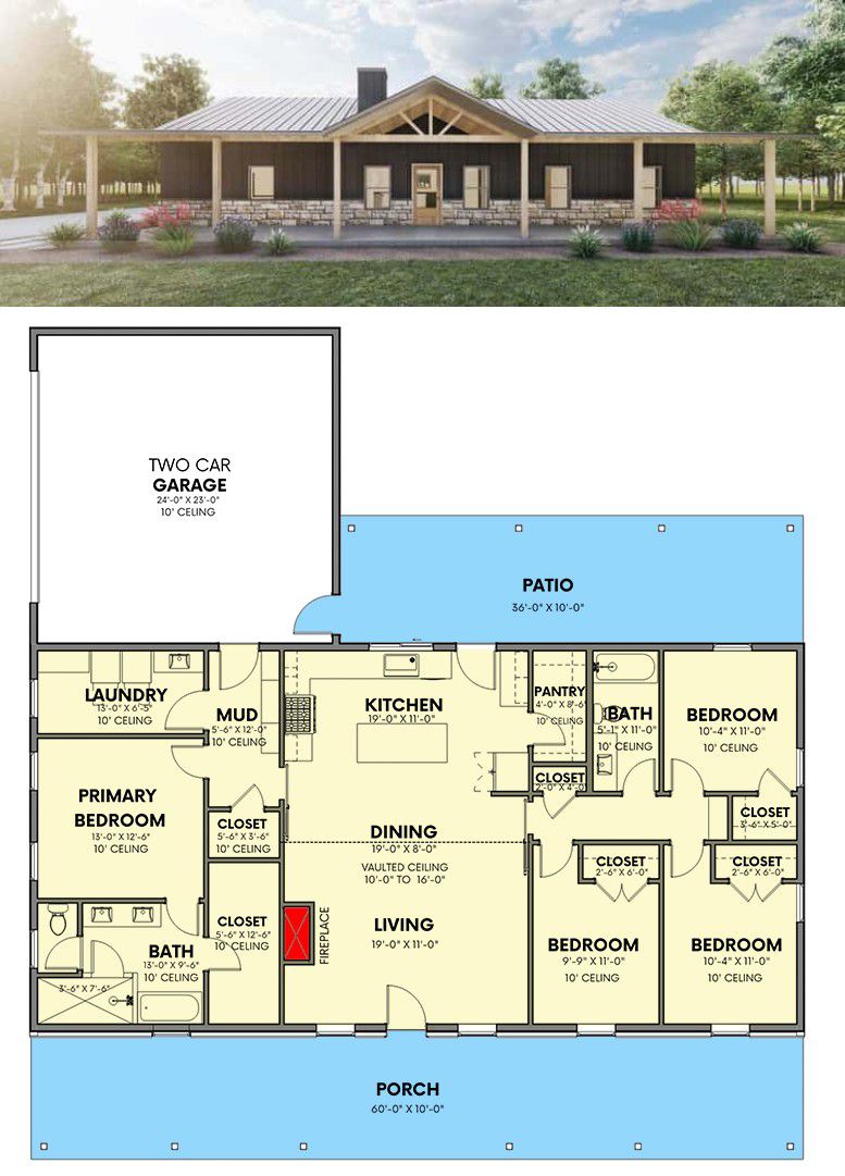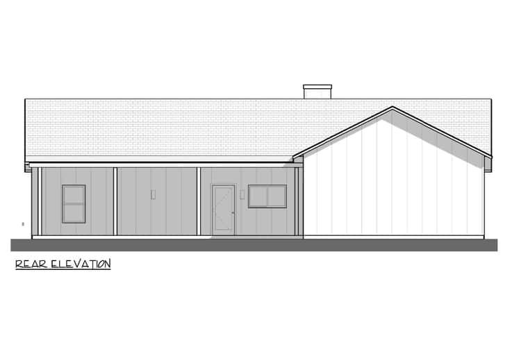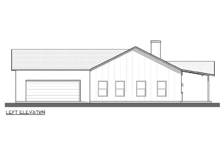 The exterior footprint is roughly 60′ wide × 65′ deep, giving the house a compact but well-proportioned presence on a modest lot. 1 The roof ridge rises to about 18′, maintaining a low-profile, ranch-style silhouette that feels cozy and grounded. 1 The attached 2-car garage sits to the side — keeping the front façade clean and functional while giving easy vehicle access without dominating the design. 1