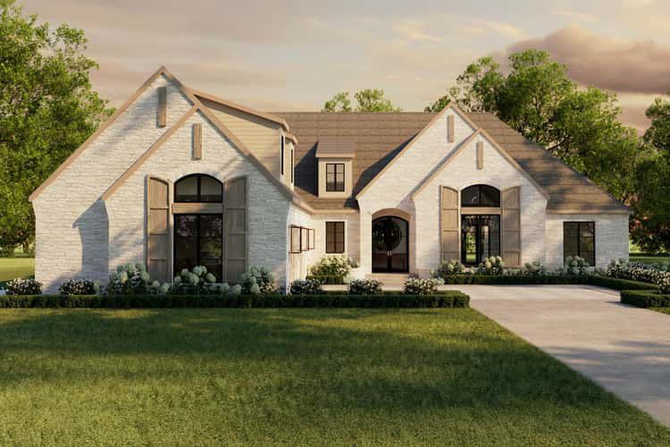 The exterior greets you with stacked front gables, brick accents, wood lintels, and oversized shutters — hallmarks of timeless French-country design. 1 A side-entry 2-car garage keeps the façade clean and classic, while the overall width (~81′ 6″) and depth (~91′ 4″) give the home a substantial, grounded presence that remains elegant and well-proportioned. 2