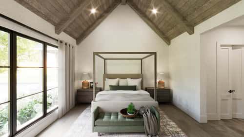 The master suite occupies its own wing for privacy. It features a vaulted, wood-beamed bedroom with large triple windows and a private bath: dual vanities, a luxurious soaking tub, a walk-in glass shower, and a private water closet. A pair of walk-in closets flanking the entrance to the bath ensures generous storage and organization. 9