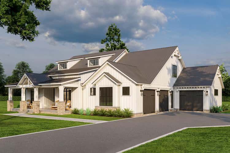 This modern farmhouse design delivers about 2,679 sq ft of heated living space, offering 4 bedrooms, 3.5 baths, and a well-designed 3-car garage. What makes it special is the emphasis on indoor-outdoor flow and flexible living — blending farmhouse charm with modern comfort. 0