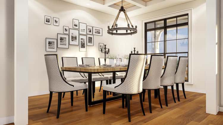 The kitchen features a large central island with a farmhouse sink and dishwasher facing toward the great room’s fireplace — making cooking and socializing seamless. 6 A butler’s pantry connects kitchen and dining areas, making storage and food prep more convenient and keeping daily clutter out of sight. 7