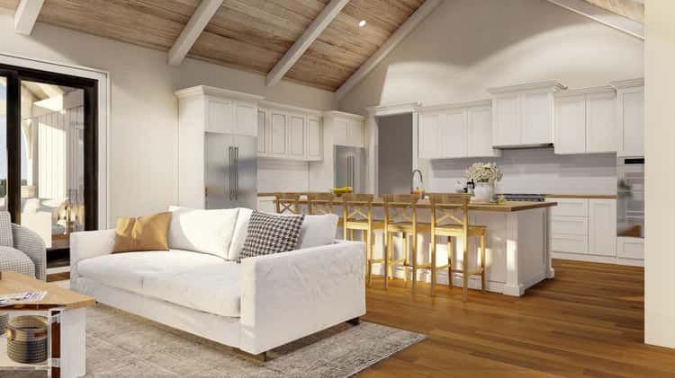 Upon entering, you’re greeted by a foyer that leads right into a spacious great room. The great room shares a vaulted ceiling with exposed timber beams that continues into the kitchen — a design choice that creates a feeling of openness, height, and gracious living. 3