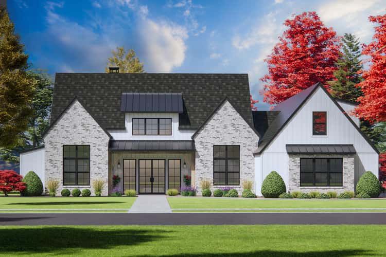This home’s exterior blends modern farmhouse aesthetics with balanced architectural details. French doors at the front and rear create visual symmetry and draw natural light deep inside. 0 A broad shed dormer centered above the welcoming front porch flanked by gables adds distinct character while enhancing curb appeal without feeling oversized. 0 Roughly 80′ 8″ wide × 74′ 6″ deep with a maximum ridge height of about 28′ 11″, the footprint strikes a comfortable balance between presence and livability for a wide range of lots. 0
