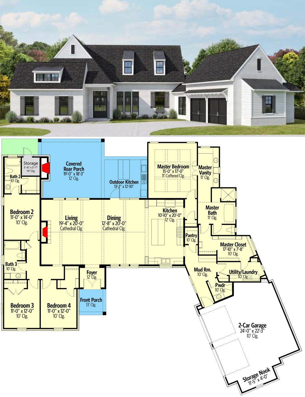 This single-story modern farmhouse plan spans about 2,825 sq ft of living space. It includes 4 bedrooms, 3 full baths + 1 half bath, and a 2-car angled garage (~713 sq ft). With a smart split-bedroom layout, generous common areas, and a large covered rear porch — it blends contemporary farmhouse charm with thoughtful, functional design. 0