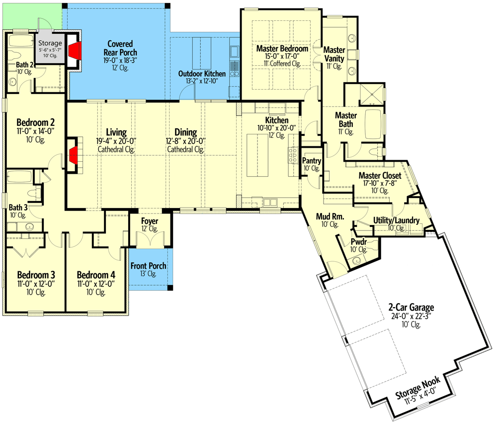 Just inside from the angled garage is a mudroom — perfect for dropping coats, bags, or shoes before entering the main living area. 12 A powder bath near the entry adds convenience for guests and keeps the main living areas more private. 13 The integration of storage, utility flow, and everyday use spaces shows this plan was designed with real life in mind.
