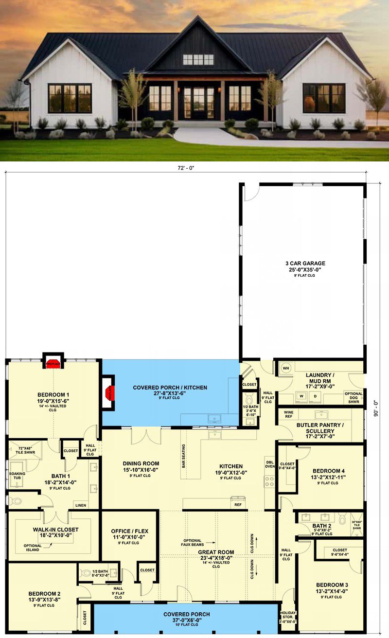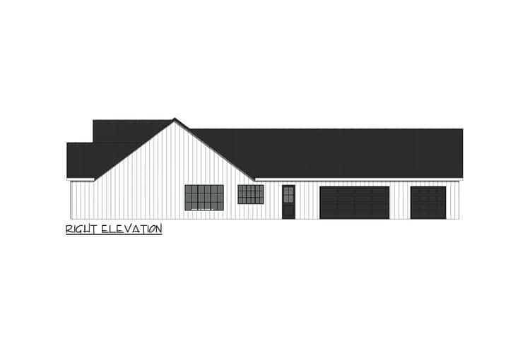 The home spans roughly 72′ wide × 90′ deep with a ridge height of about 23′ 9″, giving it a well-proportioned and grounded footprint. 1 The attached 3-car side-entry garage helps keep the front facade clean and uncluttered, preserving the modern-farmhouse aesthetic while providing ample storage and parking. 2