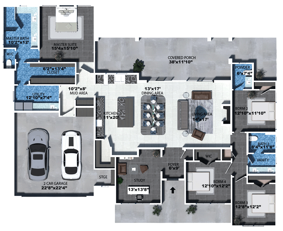 The three secondary bedrooms are grouped on the opposite side, sharing common bath and hallway access — a layout that works well for kids, guests, or roommates, while keeping noise and activity away from the master zone. 8