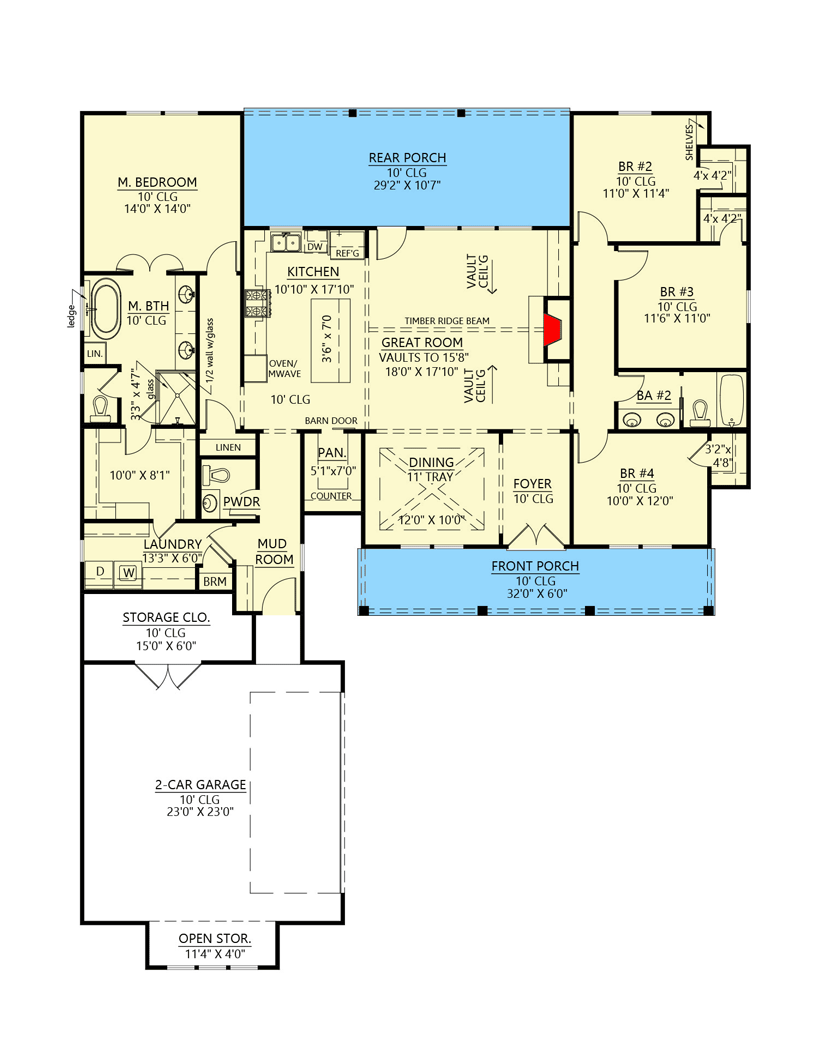 - Ceiling & Roof Details: First floor 10′ ceilings; vaulted great room 15′ 8″; roof pitch 9 on 12 (main) / 12 on 12 (secondary) for classic farmhouse proportions. 13