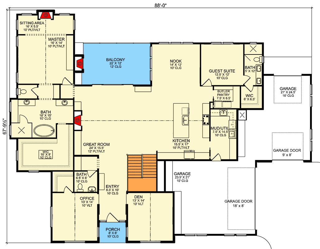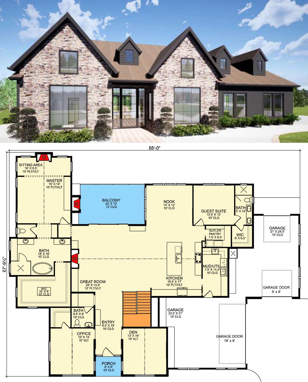 - Footprint / Dimensions: ~88′ wide × ~67′ 6″ deep; steep roof profile for mountain style 0